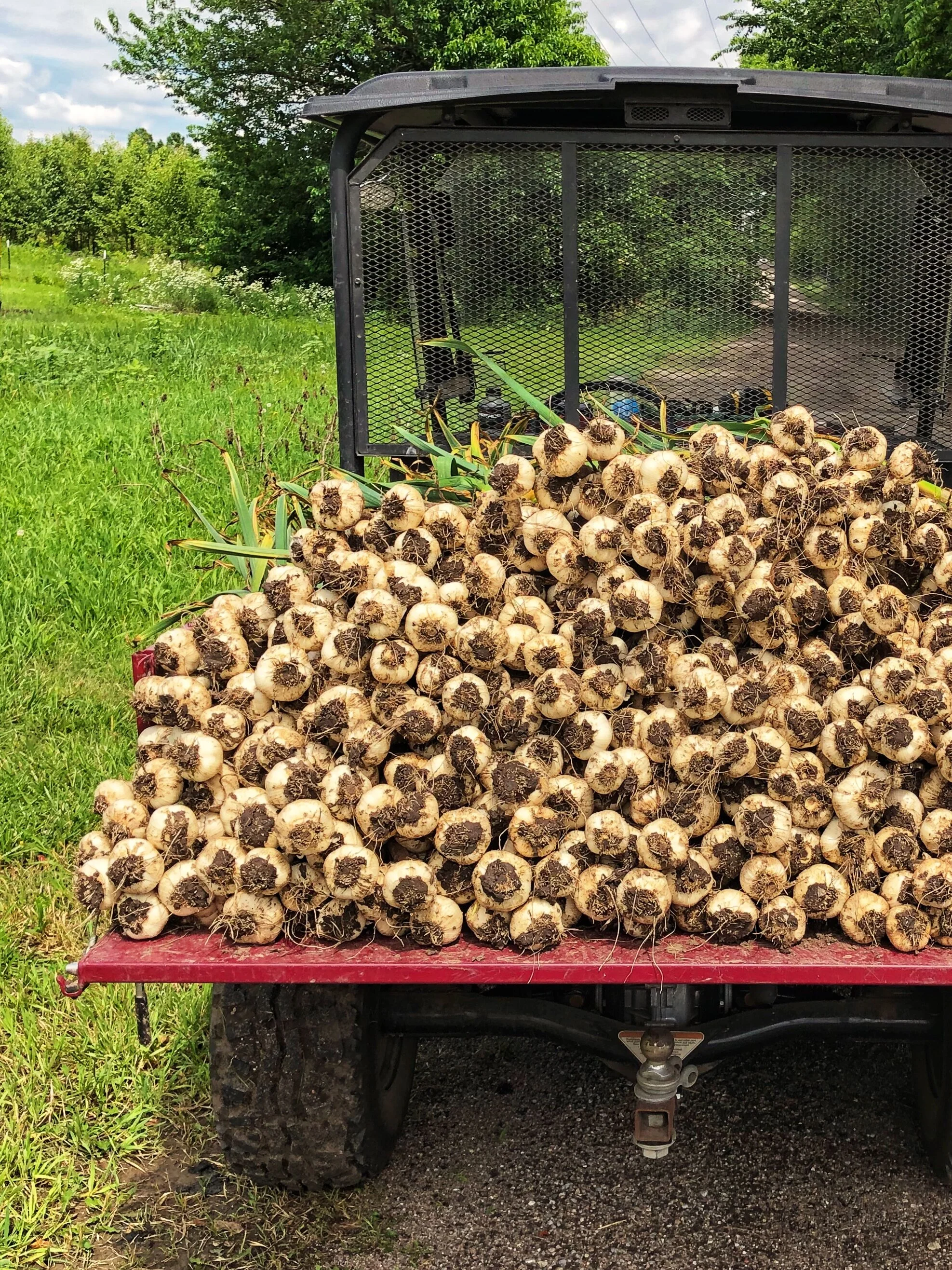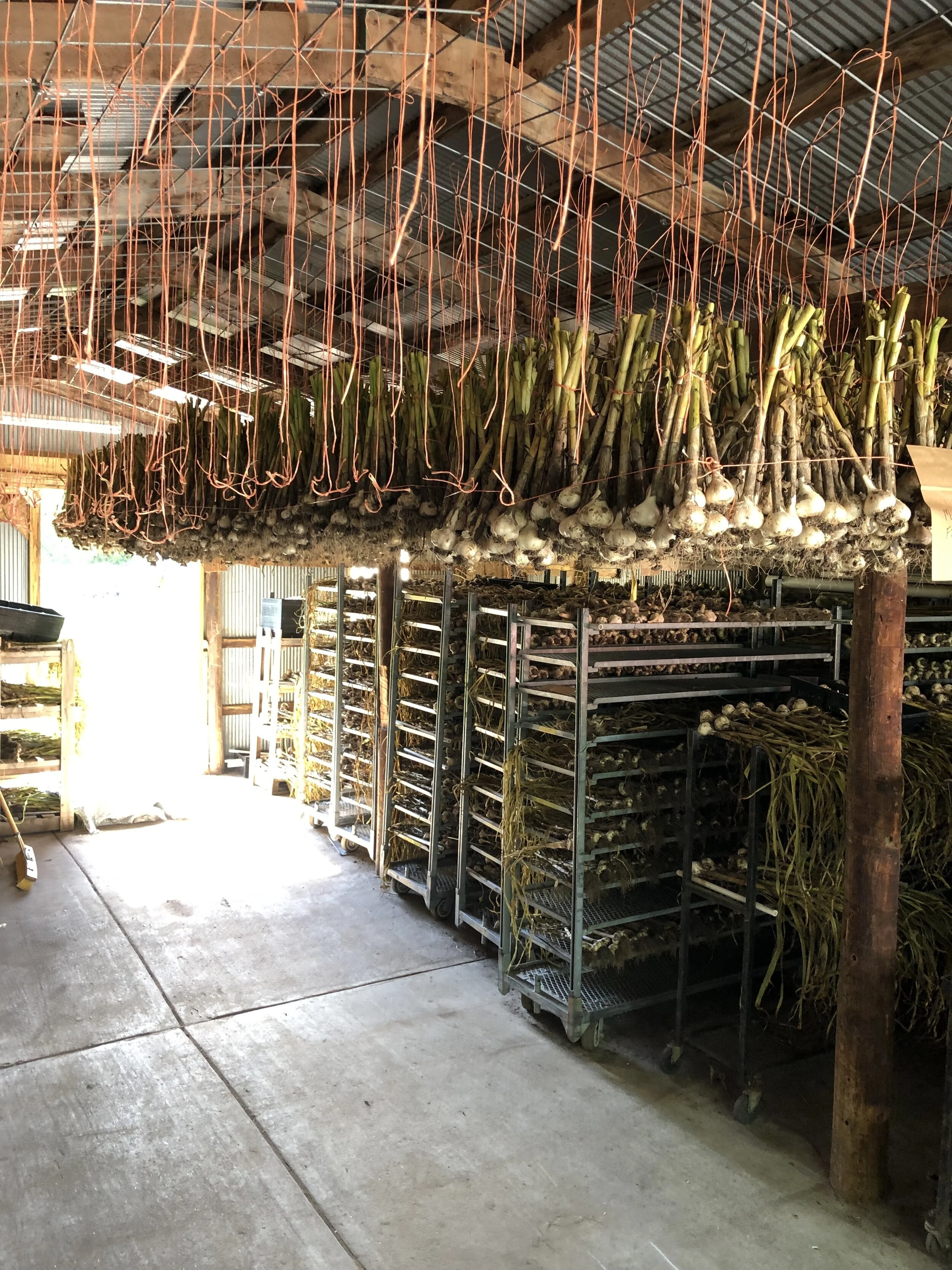 While in season, cured garlic is eligible for nationwide USPS shipment as well as local pickup and delivery. All of our garlic is harvested (by hand!) each year in June.